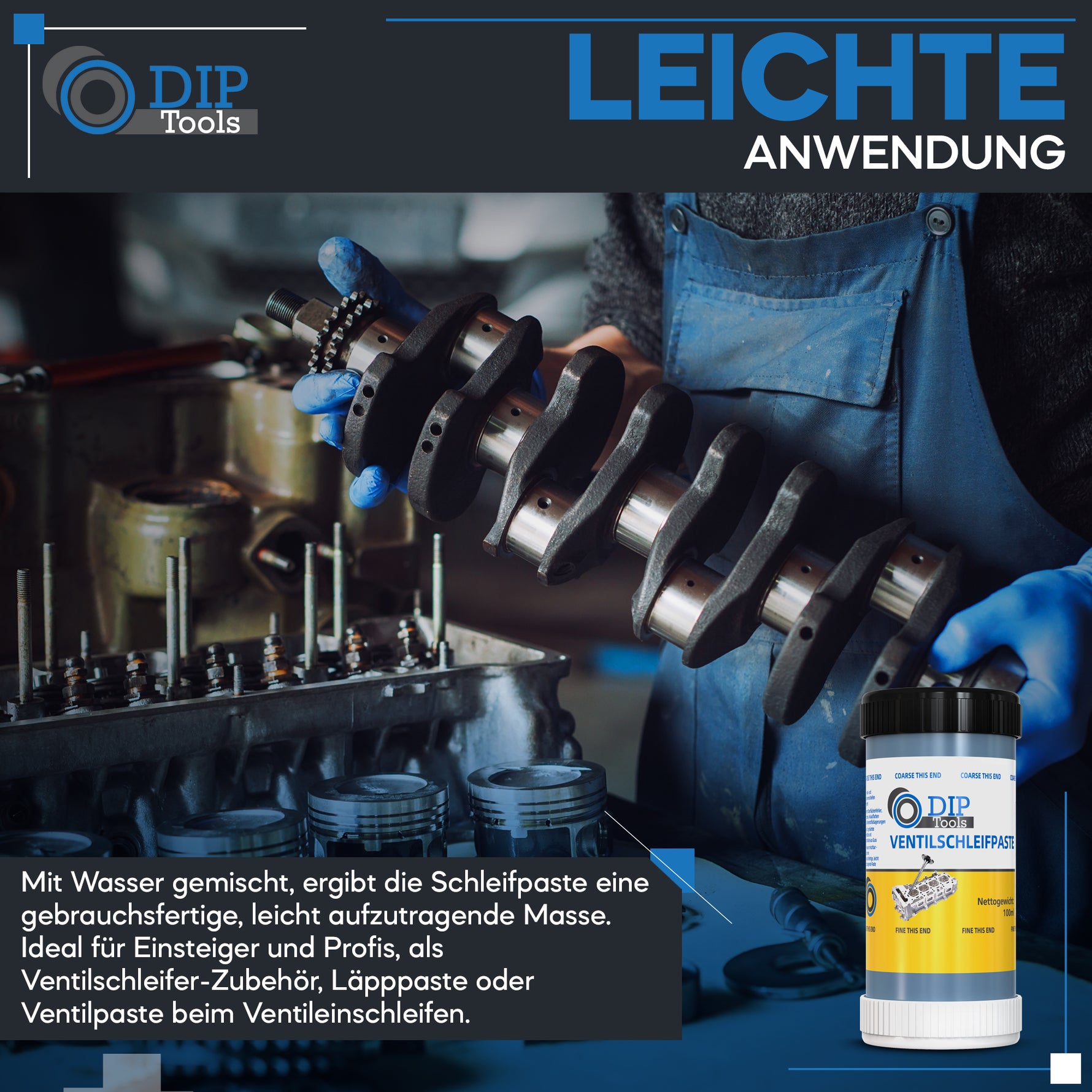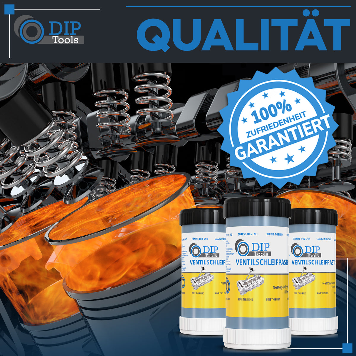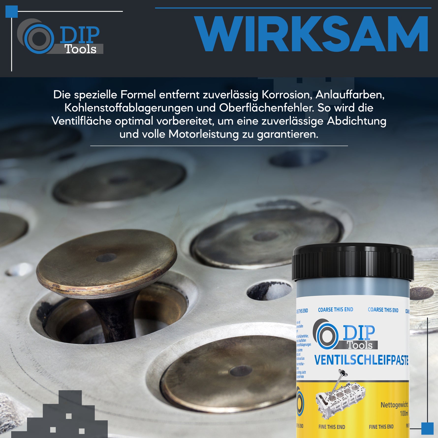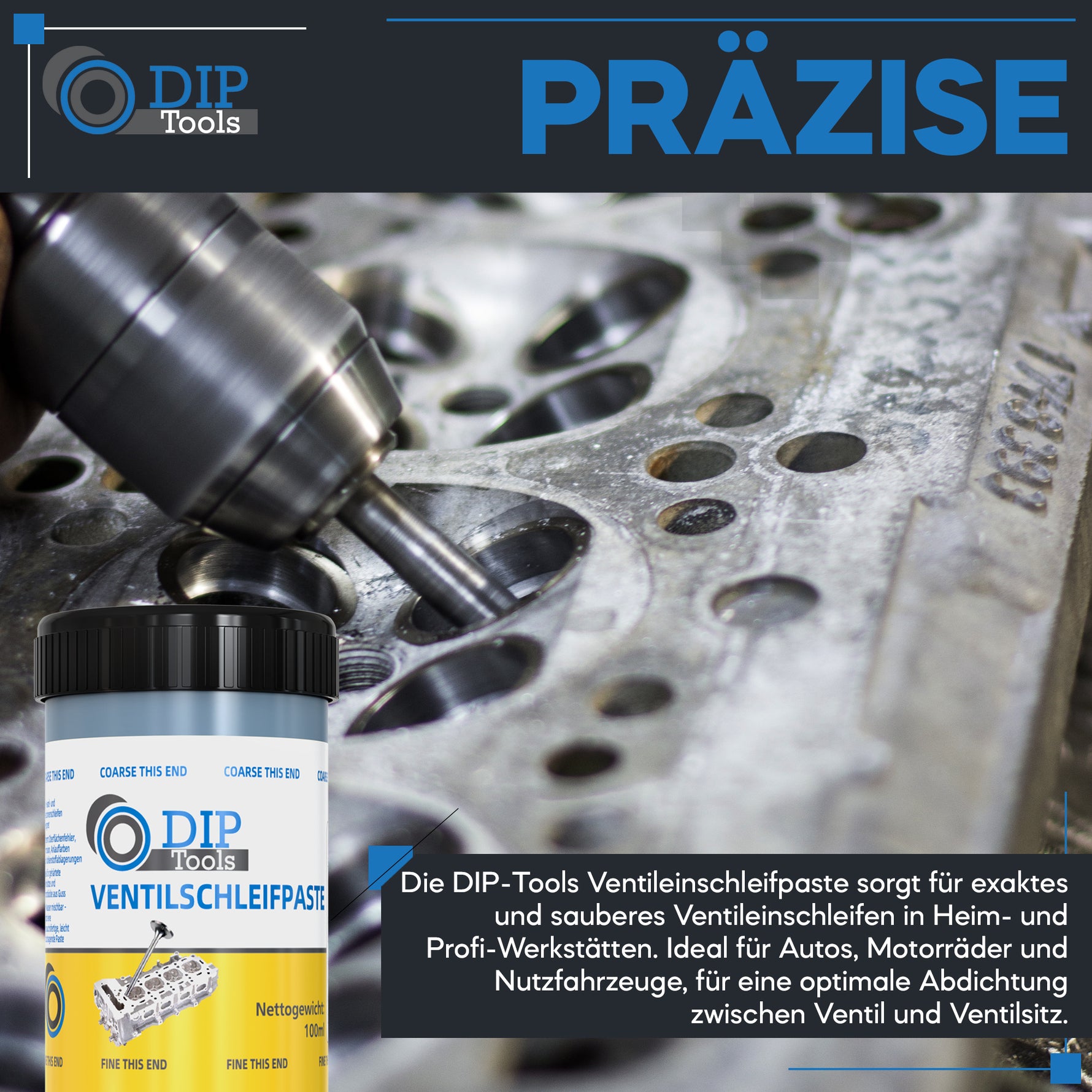 Als Teil eines Schleifsets für den Werkstatteinsatz oder als einzelnes Werkzeug für ambitionierte Hobbyschrauber ist die DIP-Tools Einschleifpaste ein unverzichtbares KFZ-Zubehör.