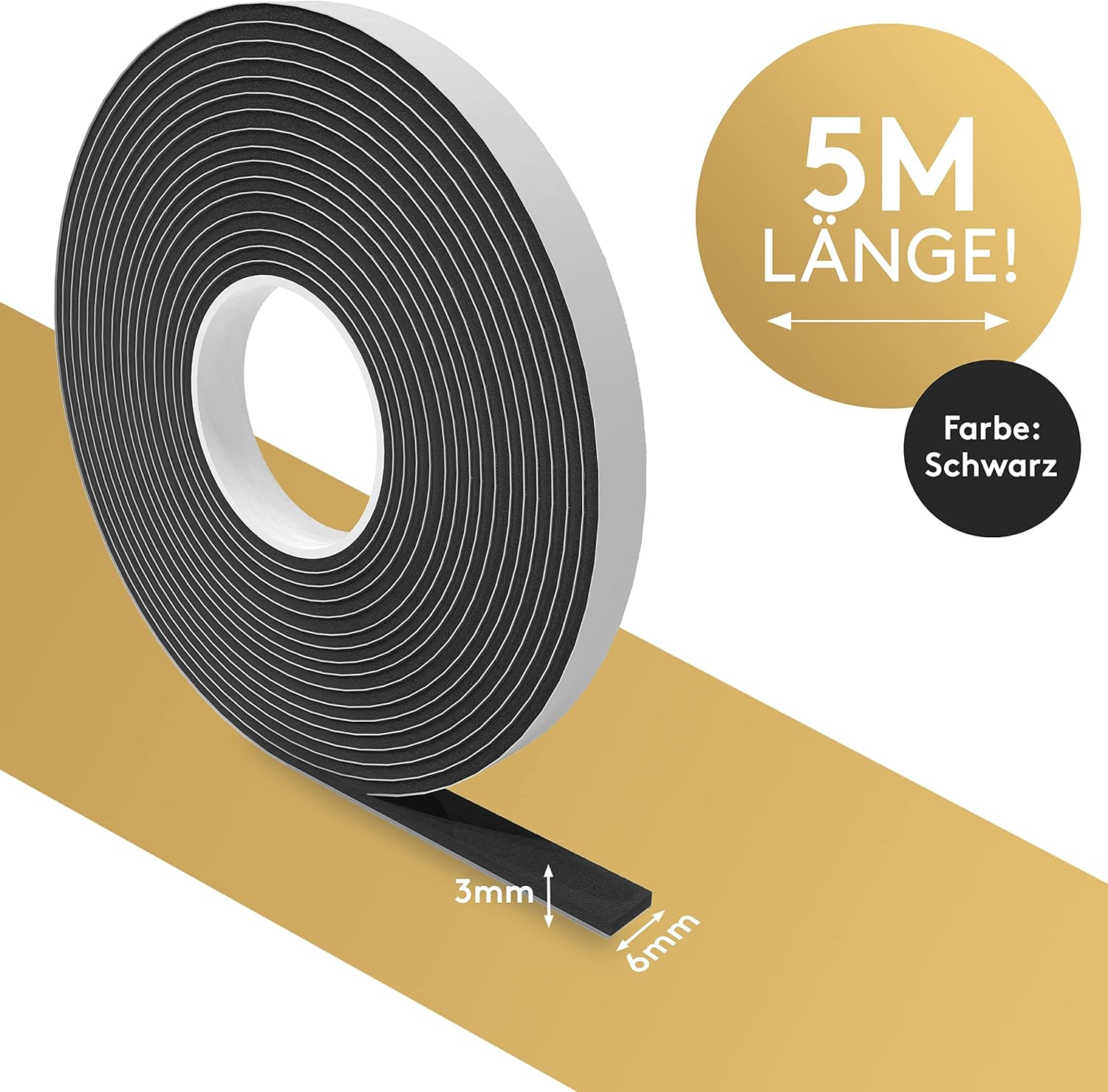 - INHALT - Je Bestellung 3x schwarzes einseitig klebendes Schaumstoff Klebeband. Schaumstoff Schwarz. Jedes Band davon hat die Maße: 6mm (Breite), 3mm (Dicke), 5m (Länge).